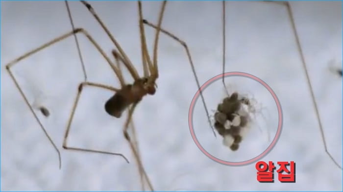 다리는 8개이면 앞의 두다리는 더듬이 겸용 다리로 사용되며 수컷보다 암컷이 더 체구가 큰 데 암컷의 경우에는 이 더듬이용 앞다리 두 개를 알을 가지고 다니는 용도로도 사용한다고 합니다. 대략 알집 하나에 10~20마리 정도의 알이 뭉쳐있게 되며 부화하면서 흩어져 나오게 됩니다.
