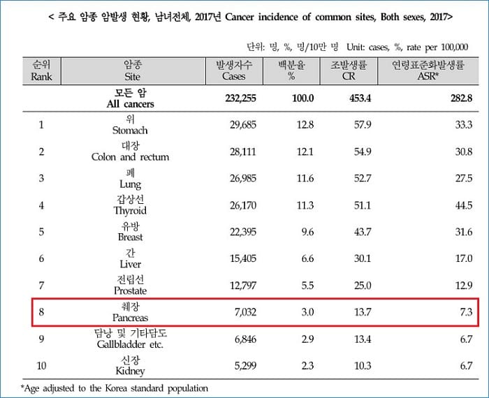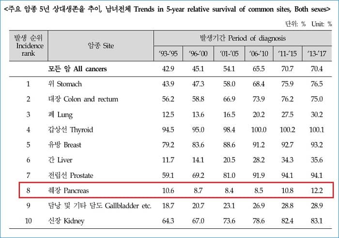 결론적으로 비록 타 암종들에 비해 발병율은 낮은 편이지만 진행이 시작된 뒤의 상황에서는 국내 주요 암종들중 가장 낮은 생존율을 보이며, 가장 치명적인 암이 바로 췌장암입니다.