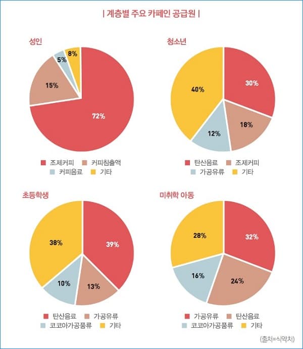 연령별로 주요 카페인 공급원을 보면 성인의 경우는 목적의식이 뚜렷해서 대부분의 소비가 조제커피 또는 원두커피를 중심으로 일어났지만 청소년, 초등학생, 미취학 아동 들의 경우에는 탄산음료, 코코아 가공품류, 가공유류, 기타 등으로 나타나 커피를 인지하고 마시는 경우의 비율보다 미인지 상태에서 섭취하게 되는 경우가 훨씬 많은 것으로 보입니다.