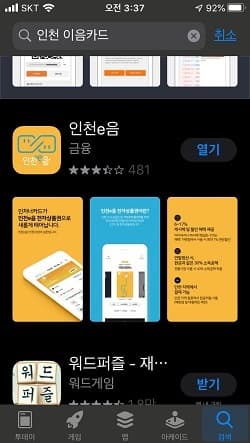 앱스토어에서 '인천e음' 또는 '인천 이음 카드'라고 검색하면 금방 찾으실 수 있습니다. 이를 다운로드하여 휴대폰에 설치합니다.