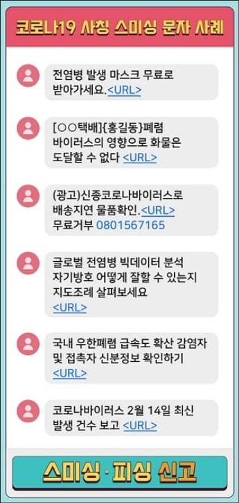 코로나 관련 문자 스미싱으로 코로나라는 단어에 집중하다 보면 아차하는 순간에 당할 수 있습니다. 한 번씩 유의 깊게 봐주시기 바랍니다.