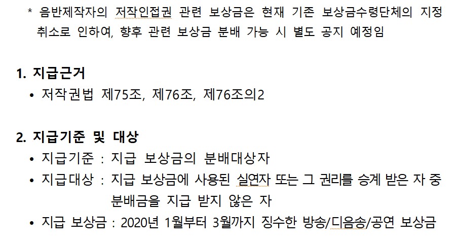 음실련이 관리하고 있는 보상금 중 공고일 현재 분배되지 아니한 해당기간의 보상금 분배를 저작권법 시행령 제7조에 의거, 다음과 같이 공고하오니 귀하의 권리를 찾으시기 바랍니다.