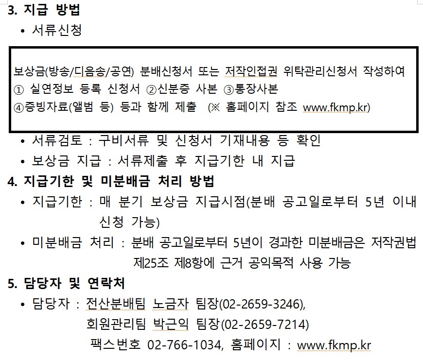 4. 지급 기한 및 미분배 보상금(보상금 분배 공고를 한 날부터 5년이 경과할 때까지 분배하지 못한 보상금을 말한다. 이하 같다) 처리 방법