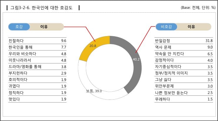 그런데 일본인들은 한국인들이 일본인들에게 반일감정을 가지고 있기 때문에 한국인들이 싫다는게 가장 큰 적대성의 이유입니다. 아래의 도표는 이 조사에 포함되었던 일본인들의 한국인에 대한 호감도 관련 조사 내용입니다.