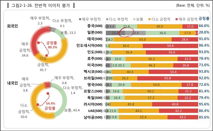 이 항목은 한국이라는 나라의 전반적인 이미지에 대하여 외국인들이 느끼는 평균 긍정률이 80.3%로 한국인들의 긍정률인 54.4%보다도 25% 가까이나 높았습니다. 그러나 이 항목에 있어서도 일본은 상상을 초월합니다.