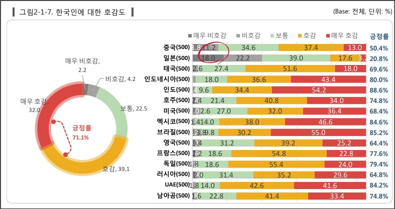 관심도보다 조금은 더 핵심적인 질문인 "한국인에 대해 좋은 감정이 있느냐?"라는 항목입니다. 위의 관심도 항목을 보셨다면 아마도 짐작이 가실 것입니다. 네 맞습니다. 이 조사에서도 역시나 일본인들은 한국인들에 대해 조사대상국중 비호감 비율에서 압도적인 1위를 차지했습니다.