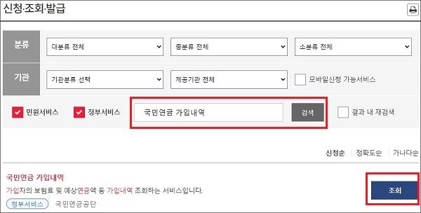 검색창에 국민연금 가입내역이라고 치면 하단에 국민연금 가입내역 신청 버튼이 보입니다.