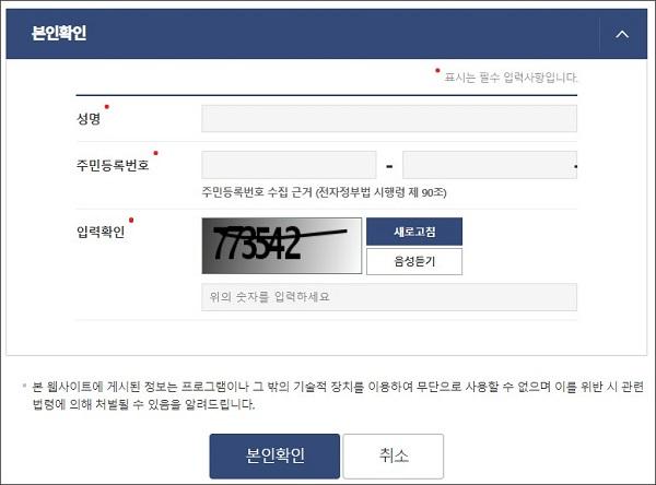처음 방문하셨을 경우에는 AnySign4 PC라는 공인인증서 암호화 프로그램을 설치하여야 합니다. 다운로드 버튼을 누르고 설치하면 됩니다. 설치하고 나면 본인 확인 창이 뜨는 데 성명과 주민등록번호 숫자 입력 인증을 모두 기입하고