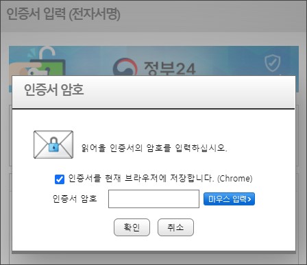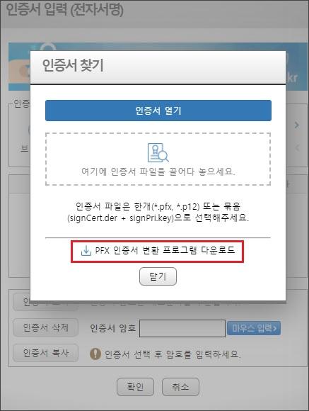 본인 인증서가 필요하다는 메시지 창이 뜨게 될 수 있습니다. 이 경우에 기존에 금융기관에서 발급받아 사용하던 공인인증서가 인식되지 않는 경우에는 인증서 입력창에서 인증서 찾기를 누른 다음 PFX 인증서 변환 프로그램을 다운로드하여 설치하시기 바랍니다.