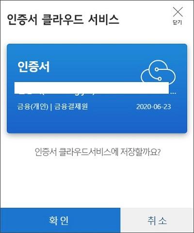 그러면 인증서 클라우드에 저장하겠냐는 창이 뜨는 데 여기서도 저장하겠다고 확인을 눌러 줍니다.