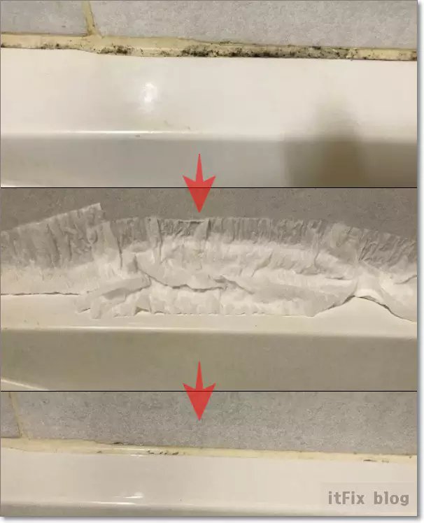 탈지면이 없어서 두루마리 휴지를 대충 곰팡이 심한 부분에 대고 거기에 스프레이형 락스 제품을 뿌렸습니다. 가장 아래의 사진은 도포 후 4시간 정도 지나서 물로 헹구어 낸 뒤의 모습입니다.