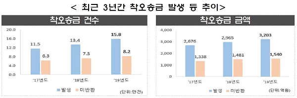 현재는 이러한 착오송금이 발생하면 금융회사를 통해서 수취인에게 연락해 반환을 요청할 수 있지만 2019년의 경우 15만 8000여건(3203억원)의 착오송금 중 절반 이상(8만 2000여건, 1540억원)이 반환되지 않고 있다.