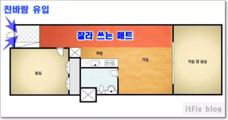 이런 구조에서 엊그제부터 강한 한파로 출입구 쪽에서 찬바람이 엄청나게 작은 틈으로 몰려들어 오더군요. 보일러를 비교적 낮은 온도로 맞추어 놨는 데도 기온이 뚝 떨어지니 너무 자주 돌아가는 게 느껴졌습니다.