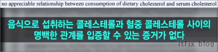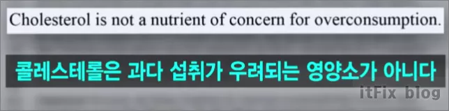"음식으로 섭취하는 콜레스테롤과 혈중 콜레스테롤 사이의 명백한 관계를 입증할 수 있는 증거가 없다. 또한, 콜레스테롤은 과다 섭취가 우려되는 영양소가 아니다." 즉, 콜레스테롤을 과다 섭취해도 괜찮다는 내용입니다.