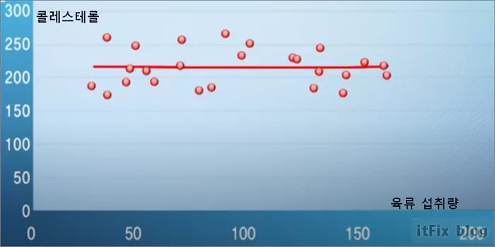아래의 지표는 일본의 쇼와 여자대학에서 조사한 콜레스테롤 수치와 육류 섭취량의 관계 조사 그래프입니다. 도표에서 보다시피 육고기를 많이 먹는 사람이나 적게 먹는 사람이나 고기 섭취량과 콜레스테롤 수치 사이에는 아무런 관계가 없었음을 보여주고 있습니다.