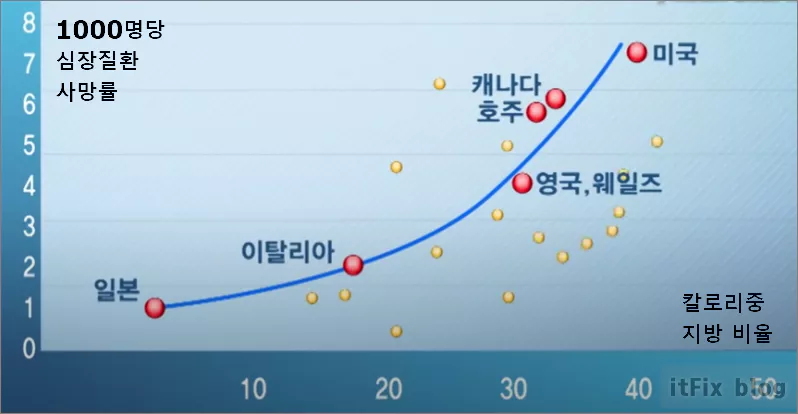 하지만, 근본적으로 이 연구는 하자가 있는 왜곡된 연구였습니다. 그가 선별한 7개국은 그의 주장을 뒷받침하기 좋은 심장병 발병률이 이미 높아 있는 이른바 잘 사는 나라들만 선별했기 때문입니다.