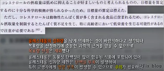 "콜레스테롤은 동물성 단백질이 많이 함유된 식품에 포함되어 있어 콜레스테롤 섭취량 제한은 단백질 부족이 발생하며, 특히 고령자에게 영양 부족이 발생할 수 있으므로 주의가 필요하다."