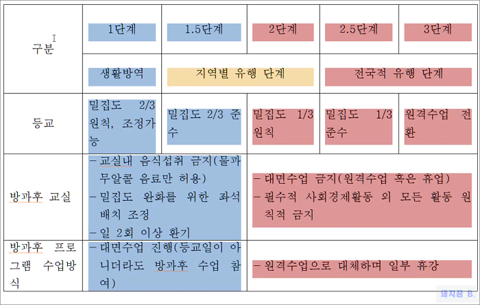 2단계와 2.5단계에서는 밀집도를 1/3 이하로 줄여야 하며, 3단계에 이르게 되면 모두 대면 수업으로 전환하여야 합니다.
