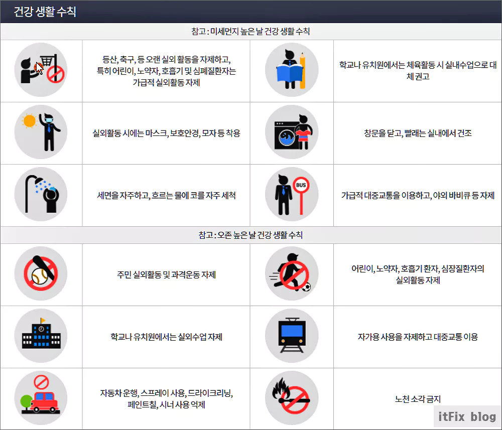 아래의 이미지는 미세먼지가 높은날과 오존이 높은날 일상생활에서 주의해야 할 점에 관한 에어 코리아의 정리 페이지인데 잘 정리된 것 같아 캡처하여 올립니다. 미세먼지나 오존이 높은 날에 참조하시면 좋을 듯 합니다.