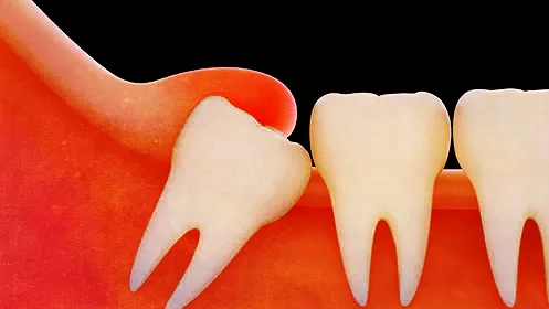 제 사랑니의 경우는 완전 매복치나 일반적인 치아와 비슷한 정상적으로 곧게 자라고 피부가 덮이지 않은 상태가 좋은 사랑니 둘 다 아니었습니다. 아래의 그림에서 처럼 피부가 반쯤 사랑니 위로 덮인 그런 사랑니여서 음식물이 자주 끼고 잇몸이 자주 붓는 그런 형태였습니다.