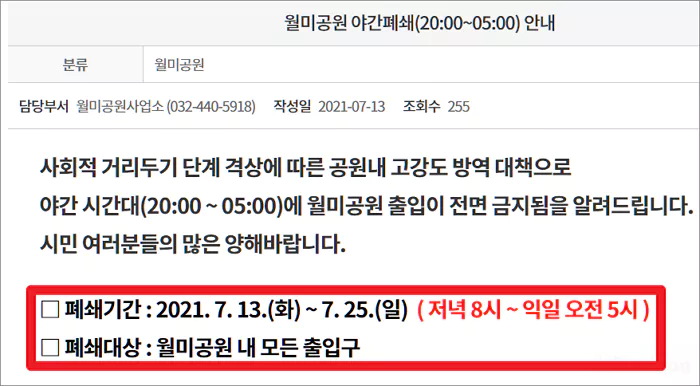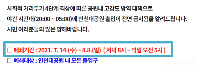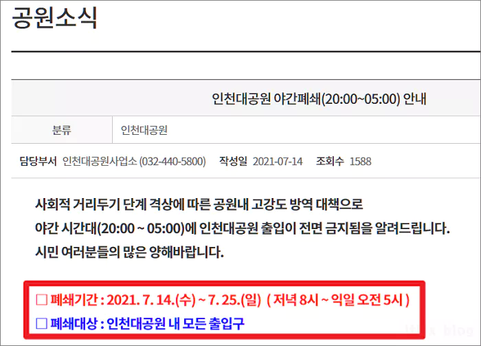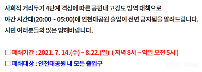 아래의 이미지에서 보다시피 인천광역시 공지에 의하면 인천 대공원은 2021. 7. 14(수) ~ 7. 25(일)까지 저녁 8시부터 다음날 새벽 5시까지에 한하여 출입을 전면 폐쇄하게 됩니다.