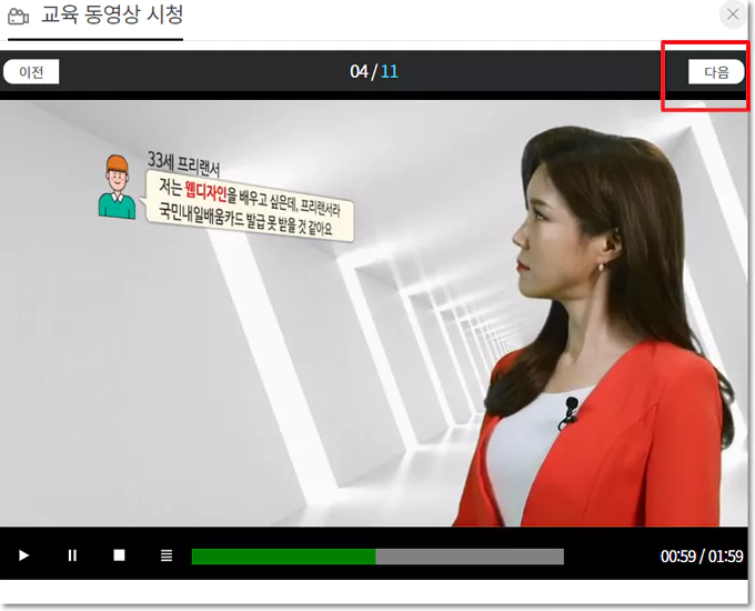 다음으로 시간이 조금 걸리는 것이 동영상 시청인데, 총 11단계로 진행됩니다. 하나의 단계가 끝날 때마다 상단의 다음 버튼을 클릭해야 합니다. 주의해야 할 점은 하나의 단계가 끝났을 때, 하단의 플레이 버튼을 실수로 다시 누르게 되면 다음으로 넘어가는 것이 아니고 해당 과정을 처음부터 다시 들어야 합니다.