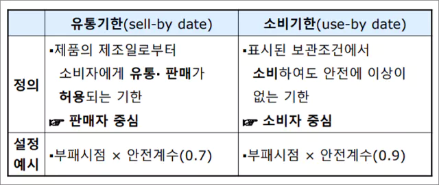 - 유통기한(sell by date) : 마트 등의 업체에서 판매할 수 있는 기간으로 식약처는 이를 시장에서 유통이나 판매가 가능한 기간이라고 정의합니다.