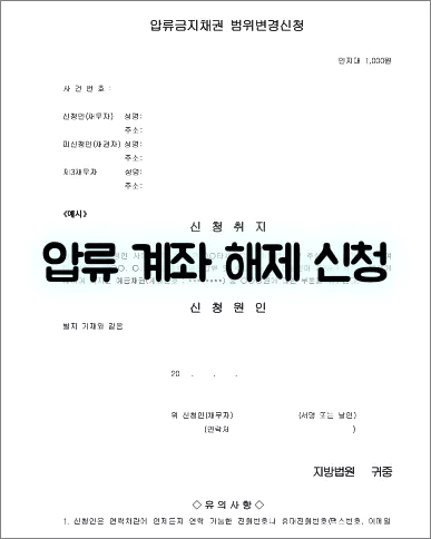 이 신청서에 적게 되는 항목으로는 신청인의 주소, 압류한 채권자의 이름(상호) 및 주소와 대표자 성명, 제3채무자(은행)의 주소와 대표자 성명, 압류 결정 사건번호 등을 적게 됩니다.