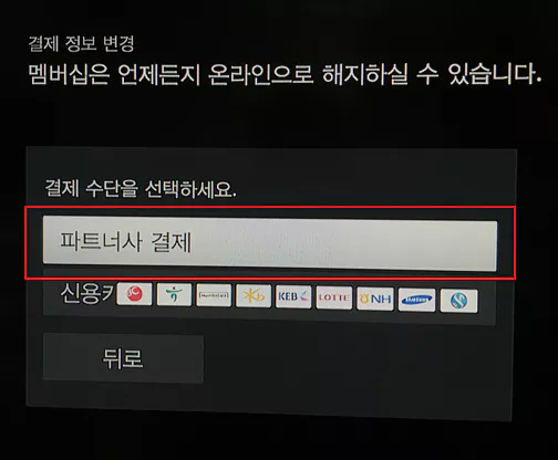 가입 버튼을 누르면 이전 카드 끝 번호가 보이지만 변경하면 됩니다. 결제 수단으로 들어간 다음 카드 아이콘이 나열된 위쪽으로 리모컨을 이동하면 '파트너사 결제' 버튼이 활성화됩니다. 파트너사란 현재 이용 중인 TV 통신사를 말하며 이 버튼을 누르고 진행하면 TV 요금에 합산 청구되는 결제 수단으로 변경됩니다.