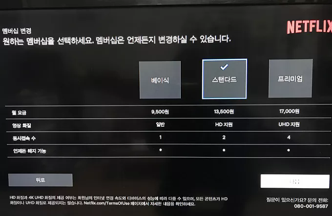 이제 요금제만 선택하면 되며, 우측 하단의 두 개의 버튼 중 요금제 설정 버튼을 누르고 새롭게 시작할 멤버십에서의 요금제를 결정하면 됩니다. 베이식은 9500원, 스탠더드는 13500원, 프리미엄은 17000원입니다. 화질과 동시접속자 수에서 약간의 차이가 있습니다. 베이식은 1명, 스탠더드는 2명, 프리미엄은 4명까지 동시 접속이 가능합니다.
