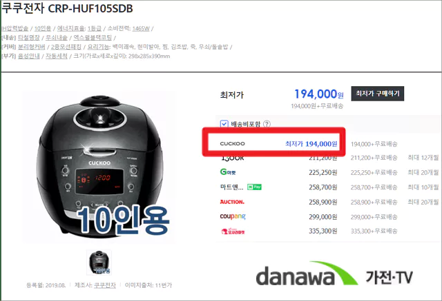 여기서의 최저가는 쿠팡이나 옥션보다 훨씬 저렴한 194,000원이고 최저가 판매처는 온라인 쿠쿠 홈페이지로 검색됩니다.