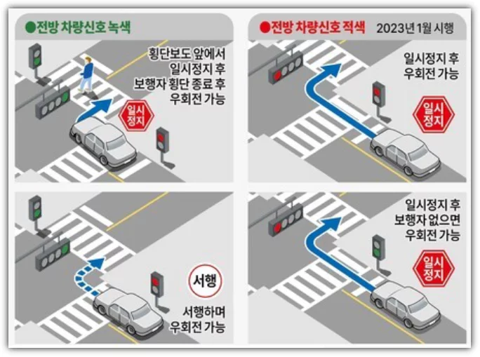 결론적으로 하나로 압축하면 보행자가 없다면 어떤 신호등의 불빛 색이 무엇이든 일시정지 없이 서행하며 통과할 수 있다는 것입니다. 다, 전방 차량신호등이 적색일 경우에만 우회전시 일시정지 규정이 2023년 1월부터 시행됩니다. 아래의 이미지에서 우측에 있는 두개의 이미지를 참조해 보시기 바랍니다.