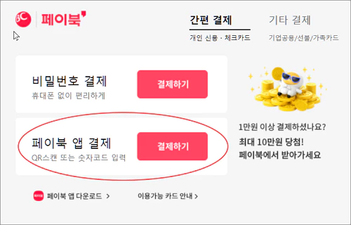 6. 페이북 앱 결제 선택후 QR 코드 또는 PC 코드 중 하나를 휴대폰의 페이북 앱을 열어 입력합니다.