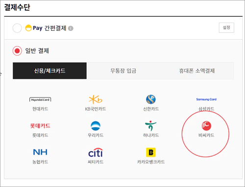 3. 일반 결제 클릭후 나타난 리스트 아이콘들 중 비씨 카드를 클릭해 줍니다.