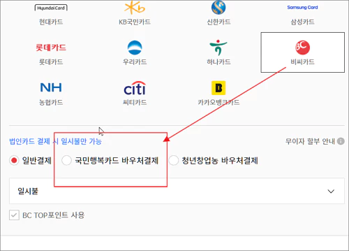 4. 비씨카드 아이콘을 클릭하면 아래쪽으로 국민행복카드 바우처 결제를 선택할 수 있는 메뉴들이 새로 나타나게 됩니다.