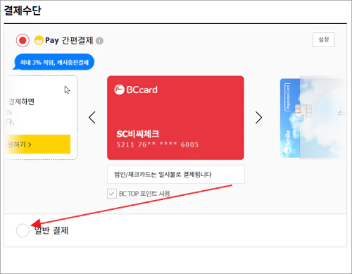 스마일 Pay 간편결제가 기본 옵션으로 선택되어 잘 보이지 않지만 그 아래쪽에 있는 일반 결제를 클릭해 줍니다.
