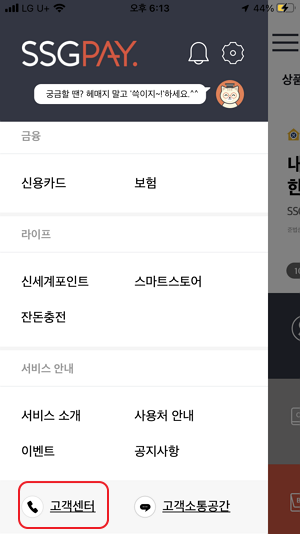 이 부분은 전혀 예상하지 못했던 부분인데 저 고객센터라는 부분이 단순히 전화번호만 나오는 게 아니라 여러 가지 하부 메뉴가 나오는 일종의 중간 메뉴 버튼입니다.