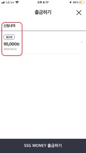 4. SSG MONEY 출금하기 버튼을 누르면 수수료 5%를 제외한 금액에 대한 출금작업이 이루어집니다.