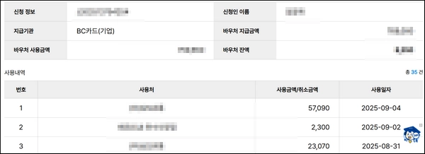 인증 완료후 잔액 조회를 누르면 아래의 이미지처럼 현재의 잔액과 이전의 날짜별 사용 내역등이 상세하게 나옵니다.