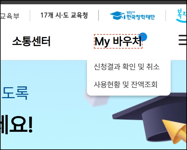 상단의 메뉴중 My 바우처를 누르고 사용현황 및 잔액조회를 클릭합니다.