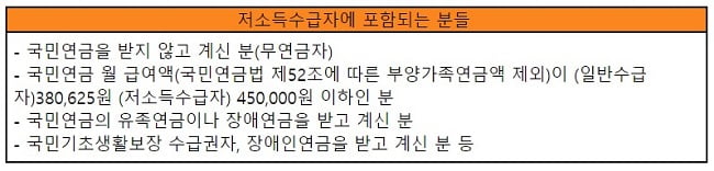 - 저소득수급자: 소득하위 20%에 해당하는 기초연금 수급자