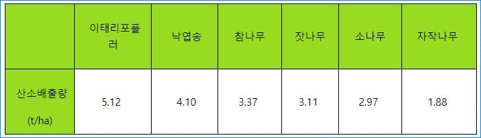 수종별 산소배출량인데 이태리포플러 나무가 월등하며, 납엽송도 좋은 점수를 받고 있습니다.
