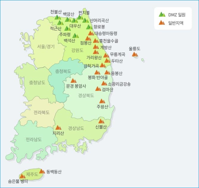 주요 산림유전자원 보호구역은 크게 강원 북부지역의 DMZ 일원과 그 이남의 지역인 일반지역으로 나누어서 살펴볼 수 있으며 현황도는 아래와 같습니다. (참조:산림청)